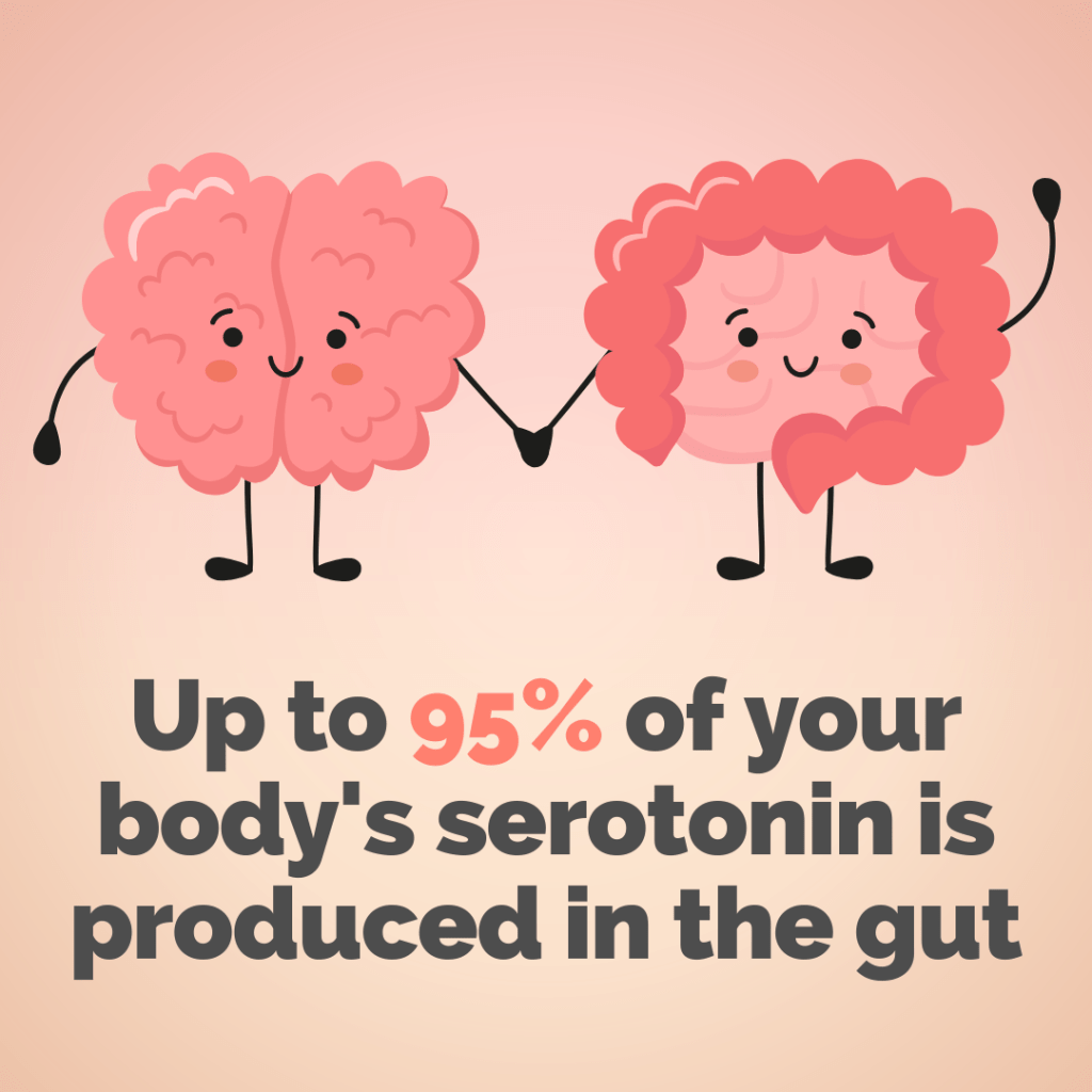 - The gut produces neurotransmitters and neurohormones, including serotonin, which regulates mood, sleep, appetite, and pain perception (7). Remarkably, 90-95% of the body’s serotonin is produced in the gut (6,7).