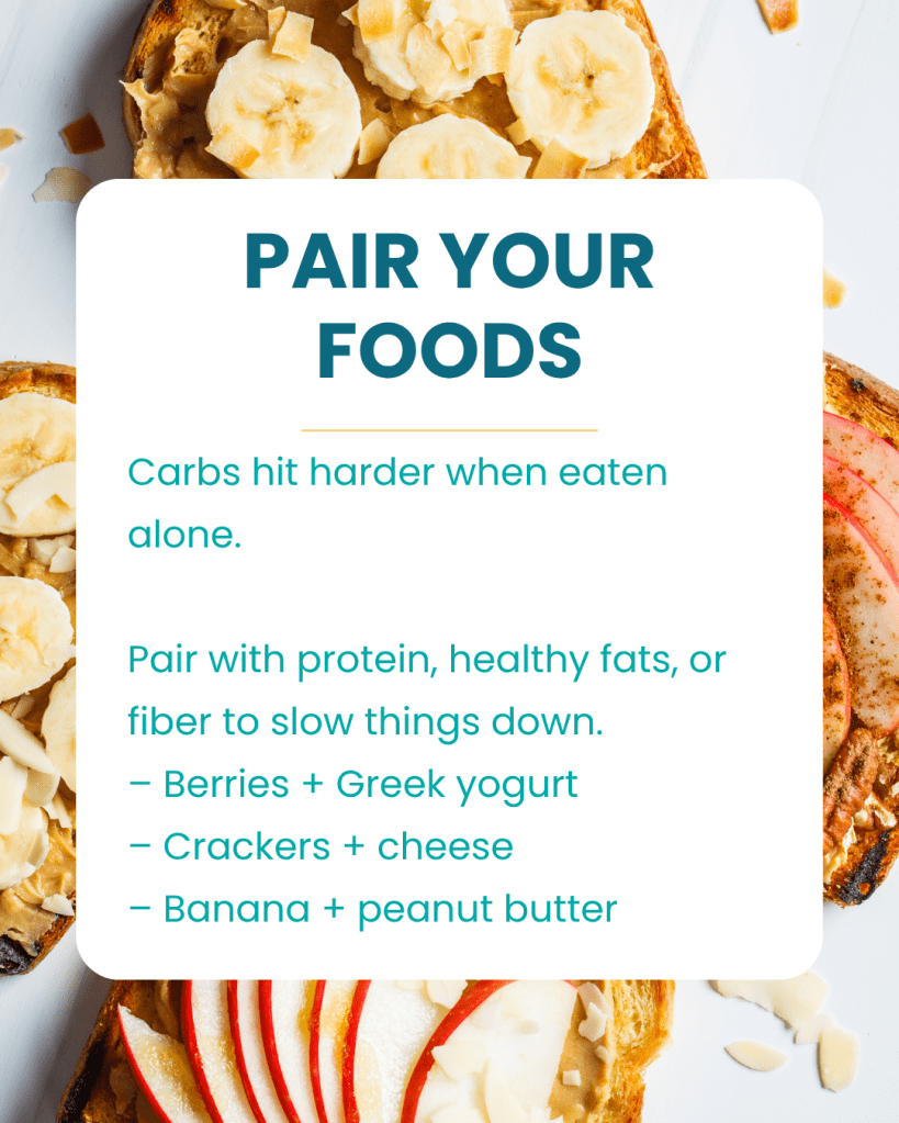 Start your meals with vegetables or protein to slow digestion and reduce post-meal spikes. Pair complex carbs with fiber, protein, or healthy fats to keep blood sugar—and mood—steady.