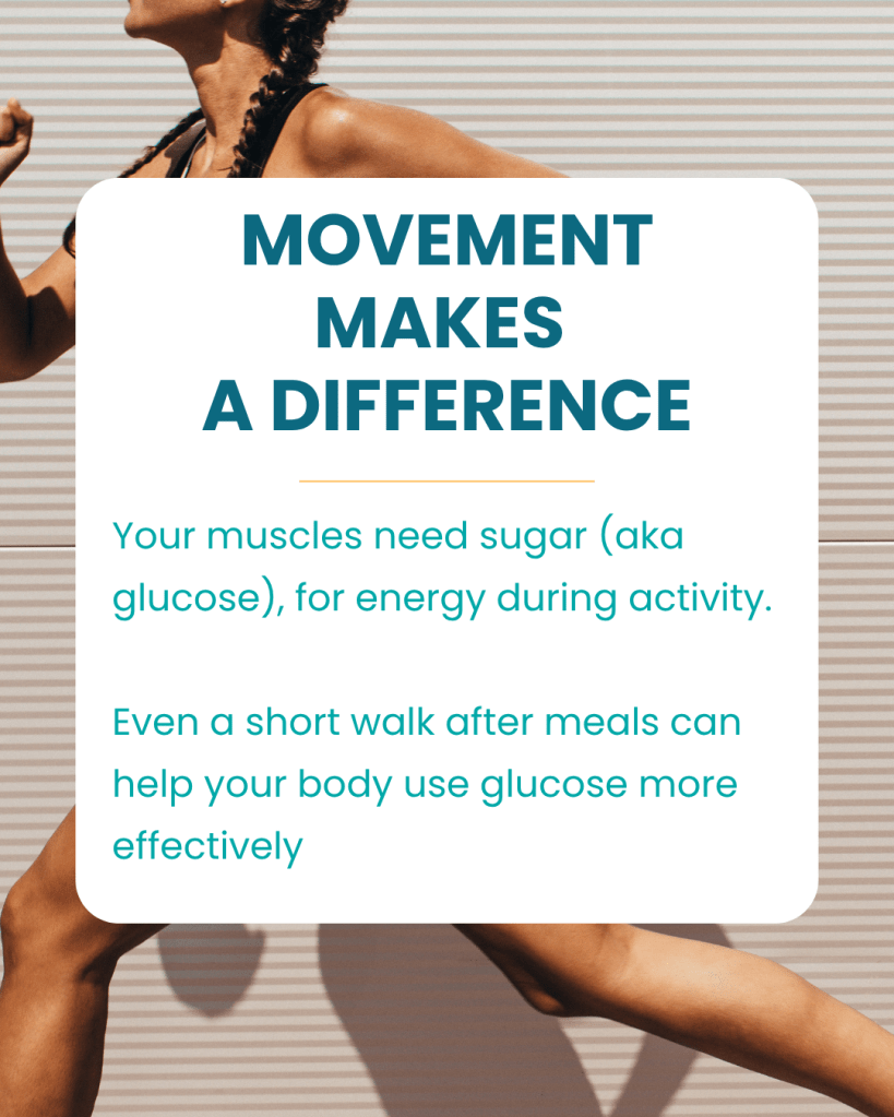 Tip: Try 10–15 minutes of walking within 30–60 minutes after eating—it helps muscles use glucose and supports digestion.